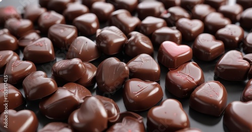 Heart-shaped chocolate candies, glossy finish, sweet, festive