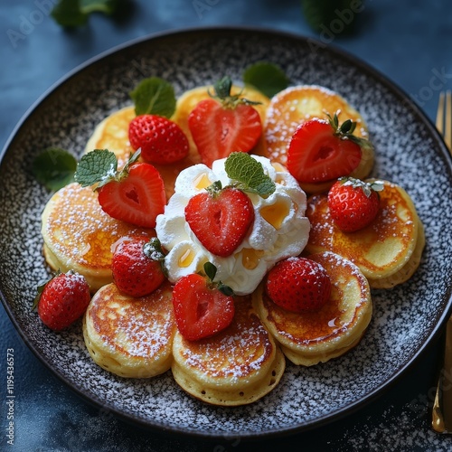 Heart-shaped pancakes topped with strawberries and whipped cream, perfect for a romantic breakfast or Valentine's Day celebration.