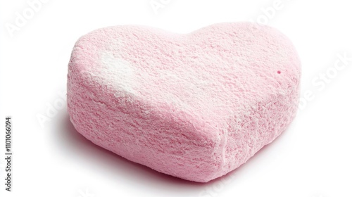 Heart-shaped pink marshmallow with a soft texture resting on a clean white background, conveying a sweet and playful aesthetic.