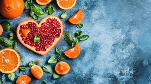 Heart-Shaped Pomegranate Seeds Surrounded by Citrus Fruits and Fresh Greens