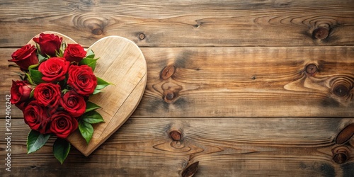 Heart-shaped wooden board with a bouquet of red roses on rustic wood background