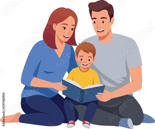 Heartwarming Cartoon Family Reading a Story Book Together with Love and Joy