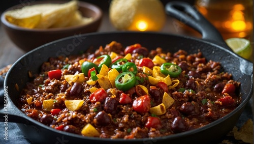Hearty and spicy chili con carne served in a cast iron pan, garnished with jalapeños and tortilla chips