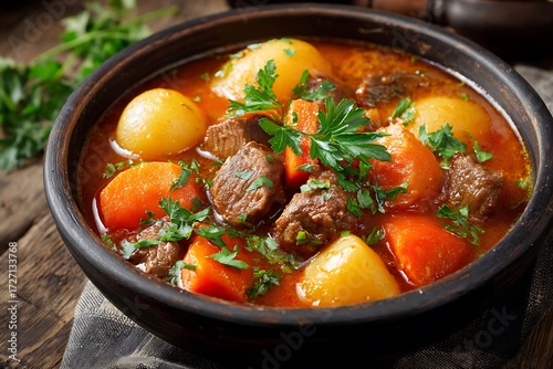 Hearty beef stew with potatoes and carrots in a rustic bowl, garnished with parsley.