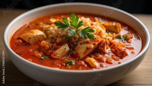 food, dish, meal, cookery, epicure, appetising, savoury, delicious, homemade, cooked, hot, warm, comfort food, nourishing, wholesome, healthy, rich, flavorful, ingredient, broth, tomatoes, vegetable, chicken, pasta, stew, soup, bowl, parsley, garnish, herb, plate, eatery, kitchen, dining, preparation, serving, culinary, photo, overhead