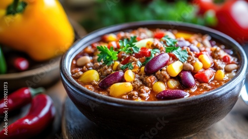chili, bowl, food, hearty, spicey, colourful, mexican, dinner, delicious, meat, bean, corn, vegetable, soup, receipe, healthy, seasoning, ingredient