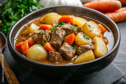Hearty Homemade Beef Stew with with vegetables – Cozy Comfort Food on a Dark Rustic Background