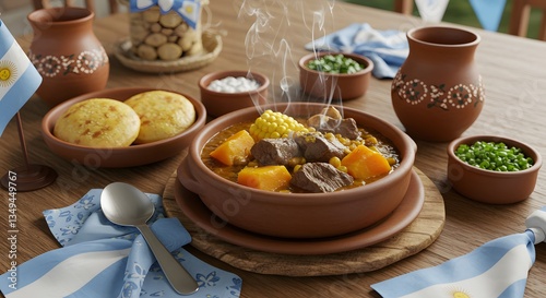 stew, serving, cooking, preparing, traditional, argentine, flag, table, wooden, indoor, meal, soup, bowl, meat, corn, squash, potato, pottery, ceramic, rustic, tableware, dish, closeup, spoon, napkin, steam, warm, eating, cookery, culture, celebration, lunch, dinner, vegetable, ingredient, portion, food, mealtime