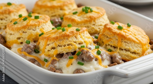 casserole, sausage, biscuit, gravy, comfort, food, breakfast, savoury, baking, dish, meal, baked, gold, brown, fluffy, creamy, chives, garnish, delicious, hearty, homemade, traditional, southern, style, family, brunch, culinary, cookery, pastry, dough, flour, receipe, oven, cooked, dinner, lunch, plate, white, tasty, cheddar