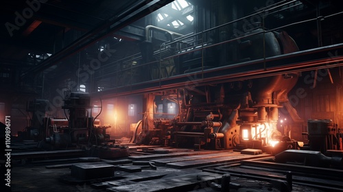 Heavy machinery shaping metal beams, ambient light, space on the right,generative ai illustration