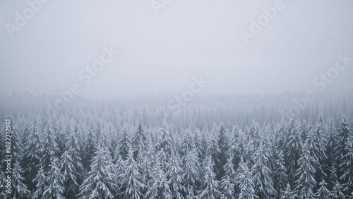 Heavy snowfall blanketing a coniferous forest on a foggy winter day. Harsh blizzard conditions in mountainous terrain. Chilly natural environment with frost-covered trees.