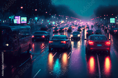 Heavy traffic in a rainy evening in the city. Scenery. Generative AI