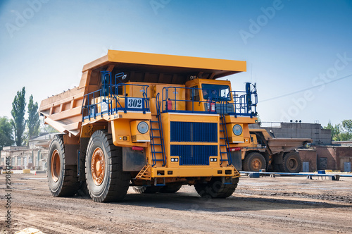 heavy yellow quarry dump truck at repair station at sunny cloudless day