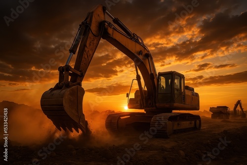 Heavy-duty excavator machine operating during golden hour construction with dramatic sunset sky and industrial atmosphere