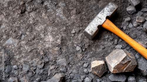 Heavy-duty hammer lying on rugged surface with rocks