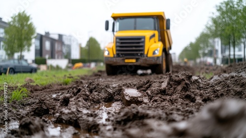 truck, dump, yellow, muddy, road, construction, dirt, heavy, vehicle, transportation, work, site, urban, residential, city, environment, landscape, maintenance, repair, machinery, equipment, modern, building, excavation, project, infrastructure, development, progress, vehicle, worksite, heavy duty, industry, technology, improvement, transport, engineering, utility, service, roadwork, contractor, public, duty