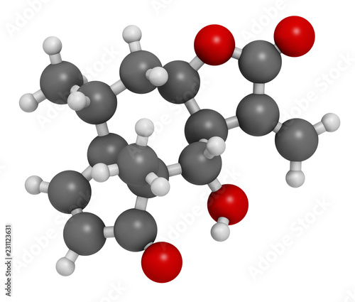 Helenalin sesquiterpene lactone molecule. Toxin found in Arnica montana. 3D rendering. Atoms are represented as spheres with conventional color coding: hydrogen (white), carbon (grey), oxygen (red).