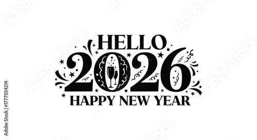 2026, new year, hallo, happy new year, celebration, greeting, festive, champaign, goggles, toast, party, event, holiday, seasonal, year, welcome, countdown, future, excitement, joy, cheer, drink, alcohol, sparkling, bubble, midnight, design, graphic, illustration, typography, text, bold, black-and-white, monochrome, celebratory, announcement, invitation, poster, banner, card, template, art, creative, modern, abstract, symbol