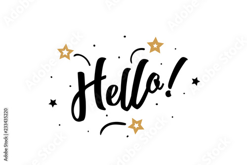 Hello. Beautiful greeting card poster, calligraphy black text word golden star fireworks. Hand drawn, design elements. Handwritten modern brush lettering, white background isolated vector