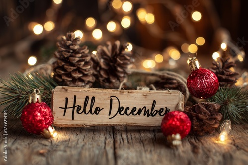 Hello December Text with Christmas Ornaments and Pinecones on Wooden Background