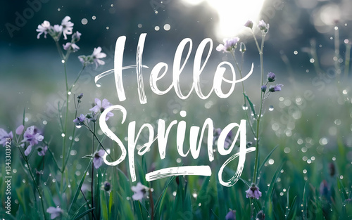 Hello Spring Text in Soft Brushstroke Font with Wildflowers and Gentle Sun Rays
