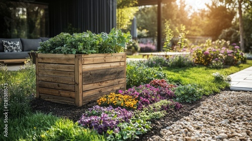 Herb Garden in a Wooden Planter Surrounded by Colorful Flowers on a Sunny Day
