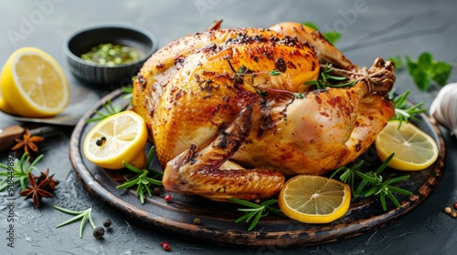 Herb rubbed roast chicken with lemon slices on display realistic food photography