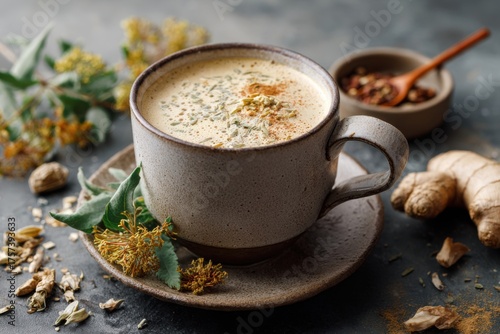herbal, latte, ceramic, cup, setting, drink, beverage, hot, calm, relaxation, healthy, natural, organic, wellness, lifestyle, choice, option, aroma, favor, refreshing, inviting, scene, background, texture, visual, attracted, composition, artistic, creative, design, soothing, life events, pleasure, indulgence, break, ritual, habit, personal, moment, peaceful, tranquil, serene, comfort, warm, cosy, environment, ambience, hot drink