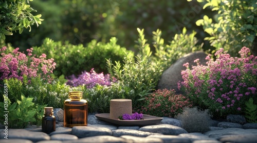 aromatherapy, oil, garden, herb, nature, calmness, wellness, summer, flower, plant, essential, bottle, spa, health, beauty, relaxation, peace, serenity, calm, organic, natural, medicine, alternative, therapy, fragrance, scent, aroma, botanical, sunlight, green, vibrant, blooming, rustic, stone, wood, healing, lifestyle, well-being, fresh, bright, high-coloured, photo, image