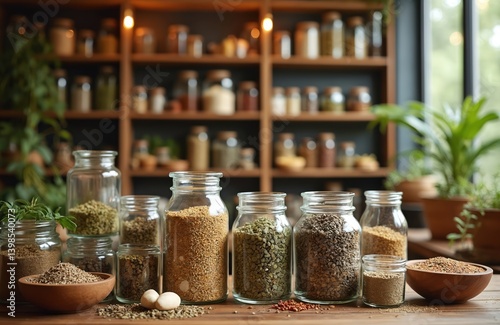 Herbal pharmacy shop with shelf of medicinal herbs in glass jars. Assortment of dried herbs, natural health products, alternative medicine, apothecary, and wellness. Healthy organic lifestyle.
