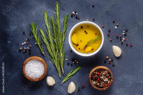 ingredient, background, cooking, up high, aromatic, concrete, copy, eating, flat, favor, food, garlic, green, herb, herbal, kitchen, lay, menu, oil, olive oil, pepper, peppercorn, receipe, rosemary, salt, seasoning, space, spice, spicey, surface, texture, top, vegan, vegetarian, view