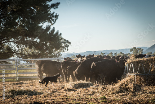 dog, collie, work, chase, muster, cow, animal, farm, grass, field, cattle, landscape, nature, pasture, grazing, cow, agriculture, meadow, horse, mammal, sky, horse, green, herd, rural, blue, graze, farm animal, farming, animal
