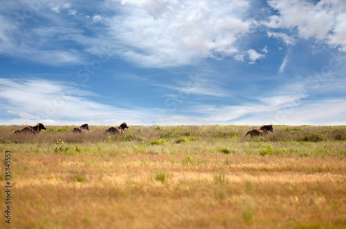 Herd of wild horses with a long mane running galloping over the steppe flowers on the island