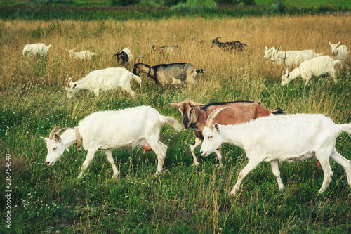 Herd of young goats in the green field