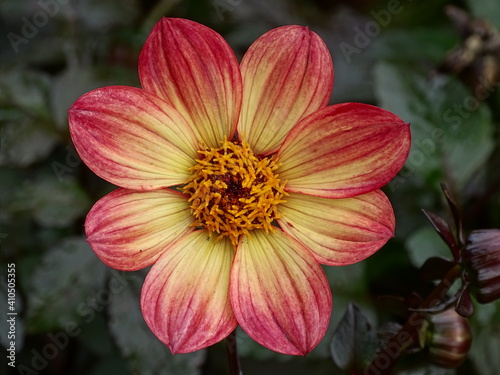HERMOSA FLOR DE DALIA. DAHLIA. CABEZA DE FLOR RODEADA DE HOJAS OSCURAS.