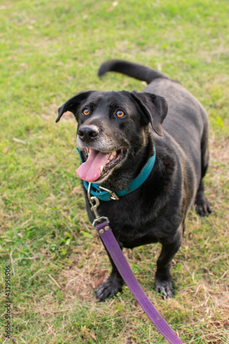hermoso perro enano labrador color negro tomandose fotos al aire libre