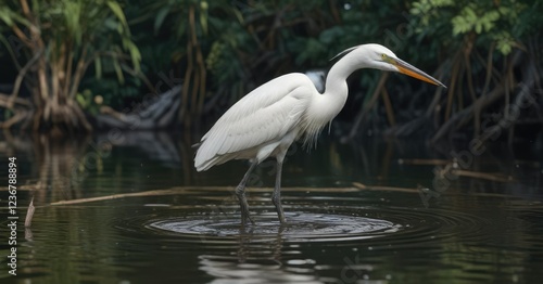 Heron-like egret wades through shallow water with beak pointed downward , hunting behavior, aquatic habitat, wetlands