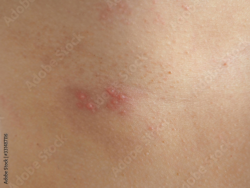 herpes zoster or shingles in woman on her skin, cause of varicella zoster virus infections symptoms of itchy ,rash and raised dots and redness with pain and tingling suffering