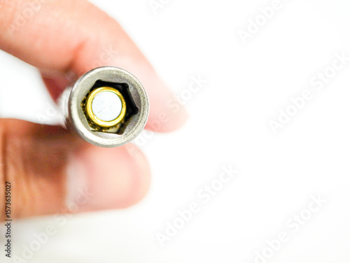 Hex socket in hand displayed against a bright white background for car repair or general tool use cases.