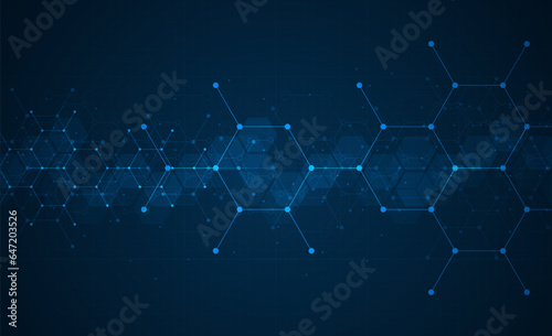 Hexagons pattern on gray background. Genetic research, molecular structure. Chemical engineering. Concept of innovation technology. Used for design healthcare, science and medicine background