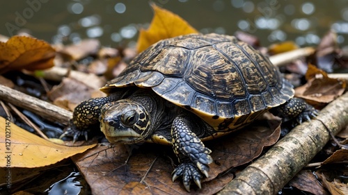 river bank, nature, fallen leaves, twig, reptile, ecosystem, biodiversity, amphibian, camouflage, habitat, natural world, flora and fauna, forest floor, natural beauty