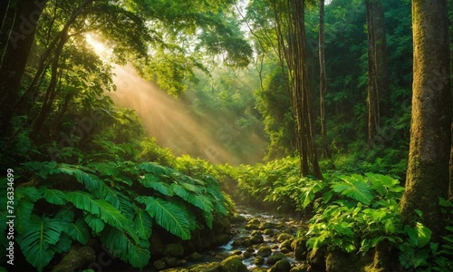 Hidden rain forest waterfall with lush foliage and mossy rocks, amazing nature