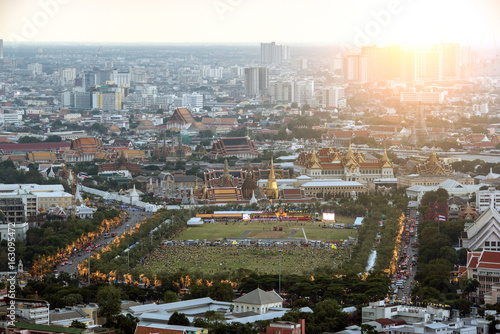 High Angle / Wat Phra Kaew at night and Bangkok Thailand Road.