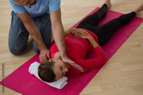 High angle view of instructor guiding student in exercising
