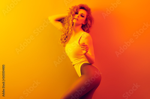 High Fashion. Woman in colorful neon gold light, make-up. Sexy blond girl, stylish curly hair, trendy bodysuit, makeup, golden neon. Creative beauty, fashionable model, voluminous hairstyle