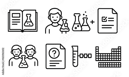 high, school, chemistry, icon, outline, icon, set, laboratory, book, student, flask, chemical, equation, homework, sheet, group, experiment, quiz, test, periodic, table, line, only