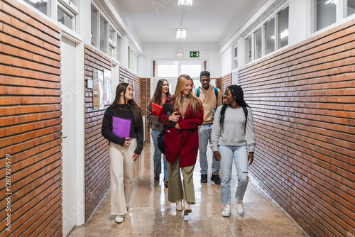 young, student, people, school, class, high, education, learning, teenage, adult, hallway, corridor, walking, talking, communication, friendship, diversity, multi, ethnic, book, tablet, backpack, casual attire, lifestyle, youth, campus, college, university, generation, back, cognition, study, academic, togetherness, happy, smiling, cheerful, carefree, real, candid, group, classmate, friends, social, interaction, break, leisure