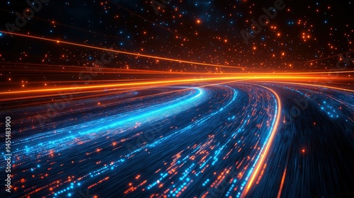 High speed light with blue and orange stripes in abstract, futuristic technological concept, showing motion blur against fast forward timeline background