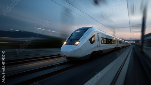 High speed train in motion during blue hour, showcasing dynamic motion blur effect that emphasizes speed and modern design. scene captures essence of travel and technology