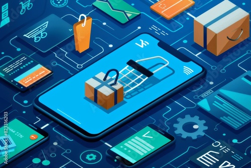 High tech vector illustration of secure online shopping with a mobile device, shopping icons, and digital interface, emphasizing safety and connectivity in e commerce